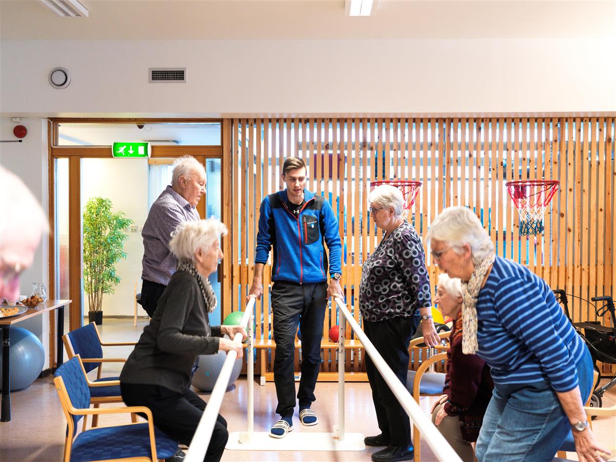 Fysio- og ergoterapitjenesten under enhet Helse og rehabilitering samler hver eneste uke flere grupper med eldre for fallforebyggende trening. Enkle øvelser under kyndig veiledning av både fysioterapaut og sykepleier sørger for blant annet bedre balanse.