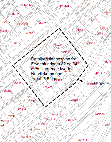Planarbeidet omfatter eiendommene gbnr. 39/452, 453, 454, 455, 456, 457, 458 og 459 på Frydenlund i Narvik kommune. Planområdet er vist med svart, stiplet linje på kartutsnittet. Hensikten med reguleringsarbeidet er å tilrettelegge for etablering av sentrumsnær bebyggelse. Bebyggelsen skal reguleres til kombinasjonsformål, og det vil åpnes for boliger og omsorgsboliger.