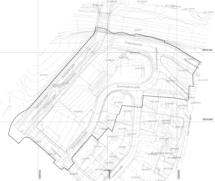 Planarbeidet omfatter eiendommene gnr./bnr. 40/897, 898, 920 og 956 m.fl. i Narvik sentrum. Planområdet er vist med svart, stiplet linje på kartutsnittet. Hensikten med reguleringsarbeidet er å legge til rette for etablering av nytt hotell, og vurdere muligheten for utvidelse og påbygg av eksisterende kjøpesenter, Thon Senter Narvik. Utvidelsen av kjøpesenteret innebærer etablering av nytt næringsareal med kontor og private helsefunksjoner. Det planlegges å integrere hotellfunksjonen med kjøpesenteret og nytt næringsareal for å få en helhetlig sammenheng mellom eiendommene.