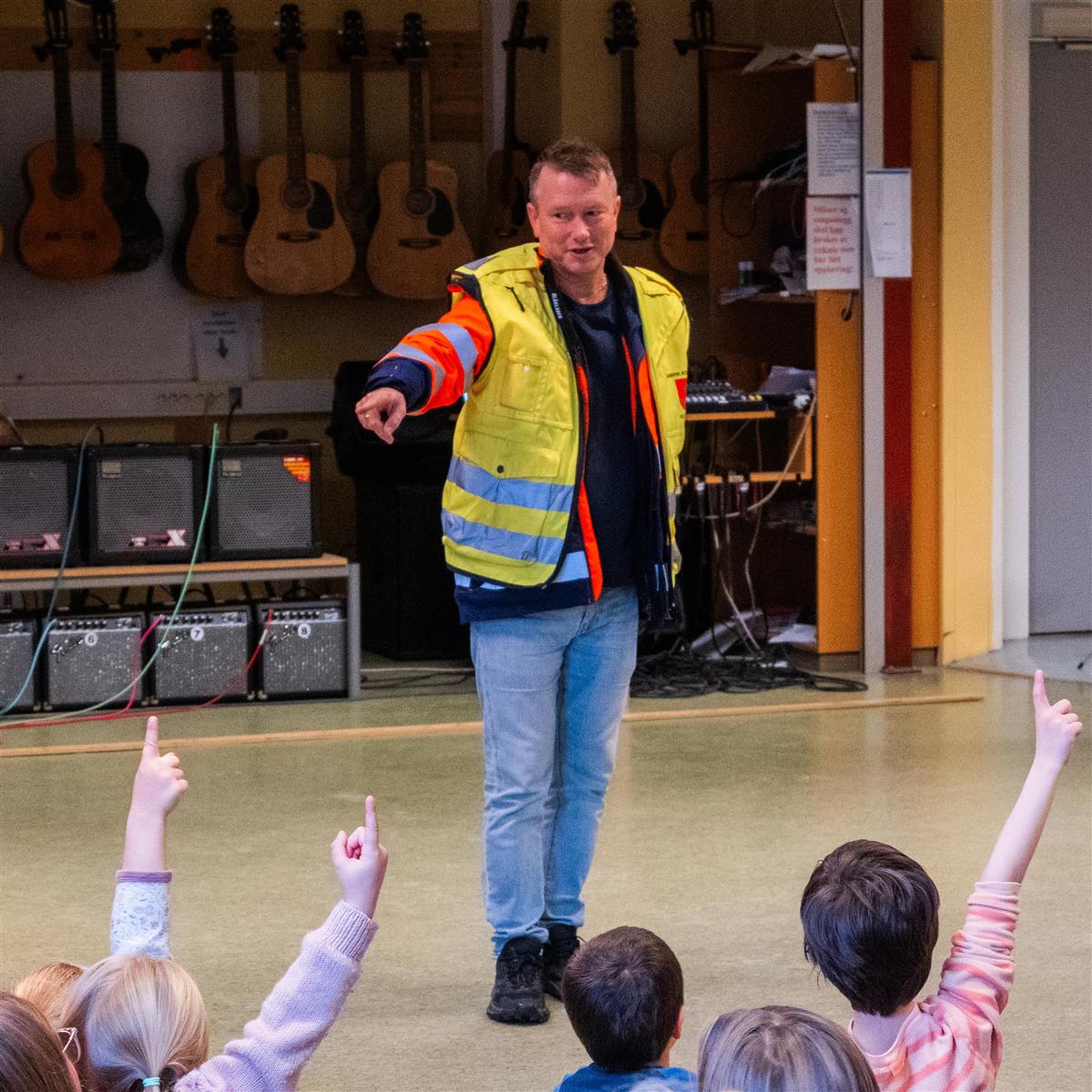 På skolebesøkene snakker om viktigheten av å vises godt i trafikken og generelt om trafikkregler og god atferd. Politiet får si noe om hvor viktig refleks er for dem i deres arbeid.