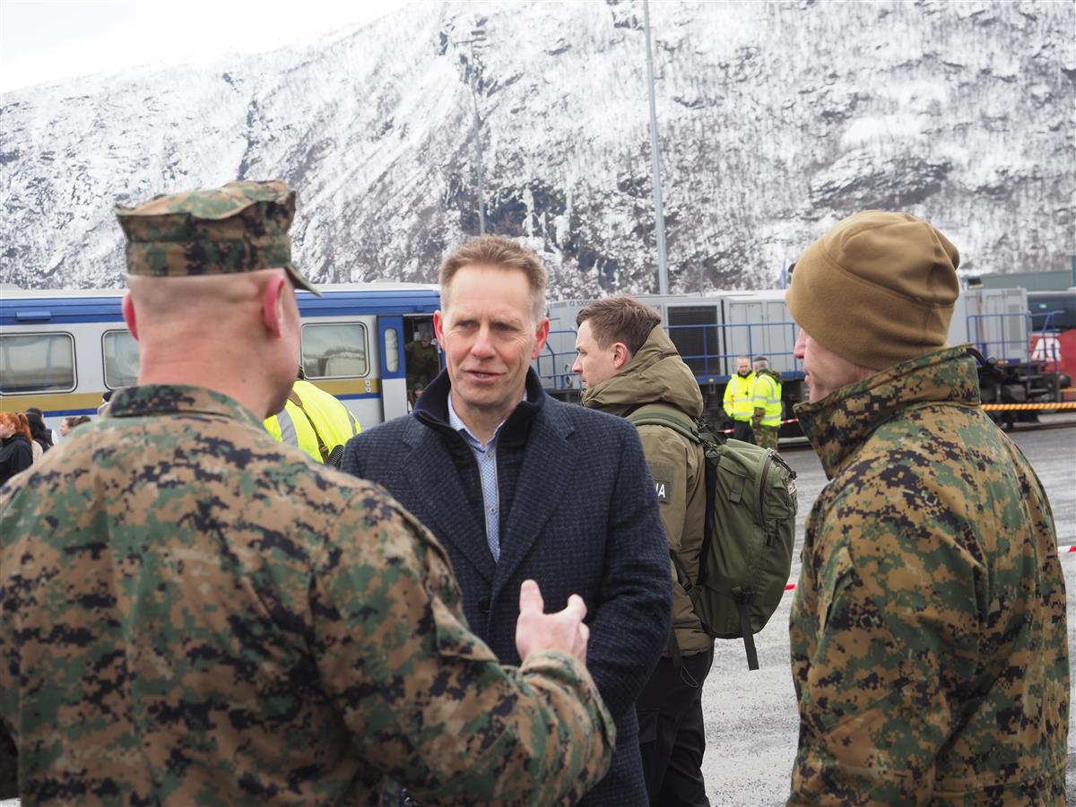 Kommunedirektør Lars Norman Andersen i samtale med mannskaper fra United States Marine Corps under Helseberedskapsøvelse, evakuering av skadde fra Finland med tog til Narvik, Cold Response 2026. – Øvelsen minner oss om at sikkerhet ikke bare handler om militær styrke. Det handler om samfunnets totale evne til å fungere under vedvarende press, sier Lars Norman Andersen.