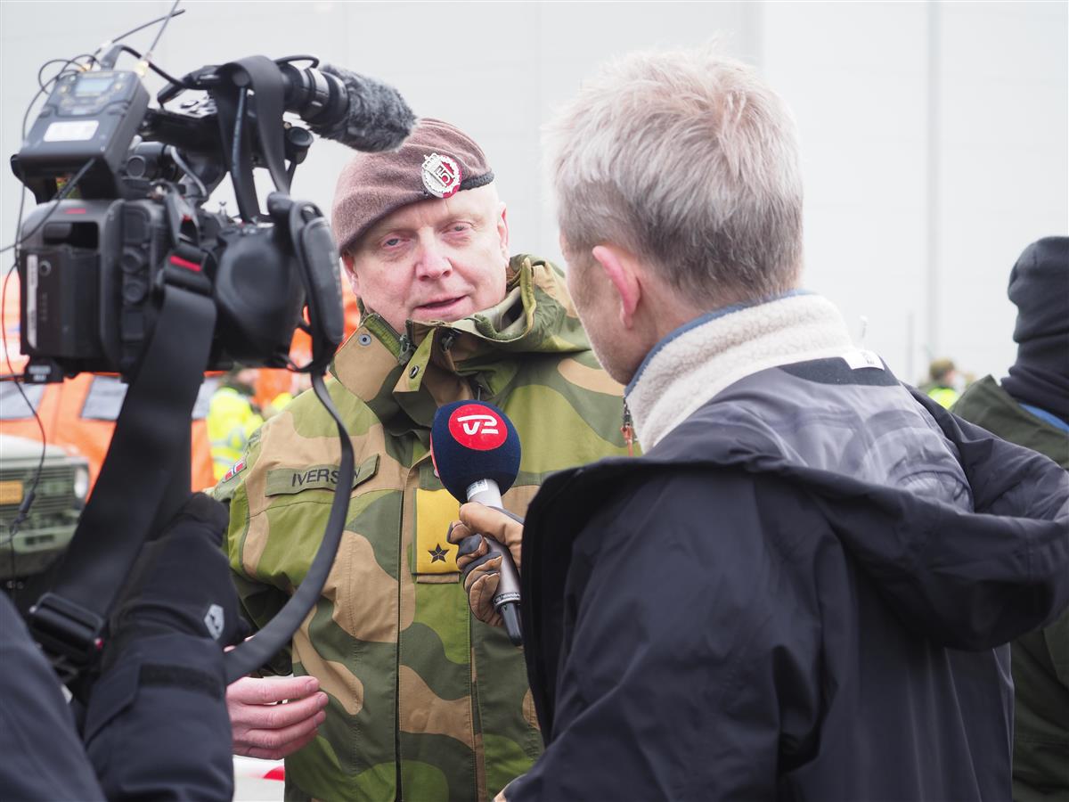 Sjef for Forsvarets Sanitet (FSAN), Petter Iversen, blir her intervjuet av dansk TV2 under evakueringsøvelsen. Narvik og Narvik sykehus ligger på et strategisk viktig punkt hvor vi på en måte får en naturlig veksling og det er et samlingspunkt i forhold til pasientevakuering og behandling, sier Petter Iversen.