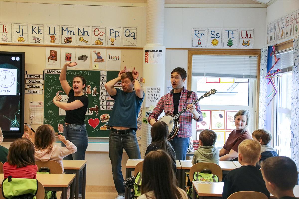 Først ute på miniturneen var Ballangen. Mandag morgen fikk intetanende elever i første-, tredje-, fjerde- og femteklasse besøk av den dansende, syngende og trioen bestående av Rebekka Undrum, Håkon Sigernes og Marius Graff. De to førstnevnte med sko med jern på tå og hæl og Marius med livfullt strengeinstrument, en banjo. I fellesskap leverer de tre fantastisk artige, poetiske tekster. Og som kjent: Det er som kjent umulig å spille en trist sang på banjo. Forestillingene deres formidler på en lærerik måte at musikk og rytme finnes i alle mennesker som en uttrykksmåte.