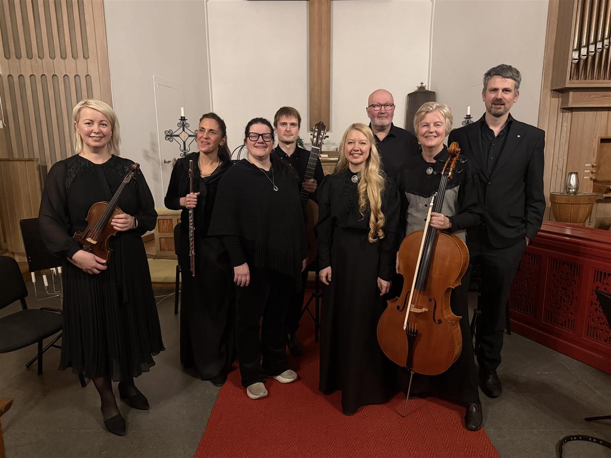 Våre egne musikere, Narvik kulturskoles pedagoger og musikalske kunstnere gjorde en nydelig tolkning av mesterverket Pergolosis «Stabar Mater». Fra venstre: Ella Zlotnikova (fiolin), Jelena Draskoci fløyte), Stine Pedersen (sang), Fredrik Seines (gitar), Jurgita Juozuniene (sang), Tor Eirik Nergård (tangenter), Gro Torvanger (cello) og Frans Tizian Roberg (klarinett).