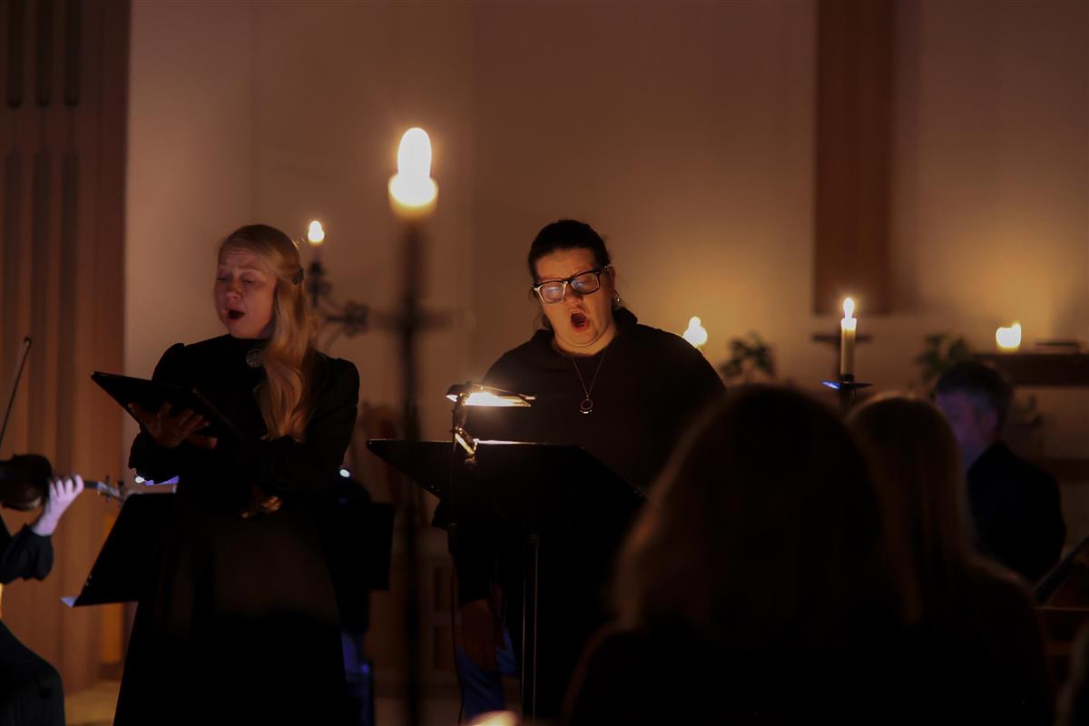 Fascinerende kombinasjon av estetikk og vakker musikk i et kirkerom vart opplyst av levende lys. Mange fant veien til Sjømannskirken siste kveld i VU for å oppleve tidløs, sjelfull barokkmusikk fremført av sangerne Jurgita Juozuniene og Stine Pedersen - sammen med de seks musikerne. En opplevelse til å bli vektløs av.